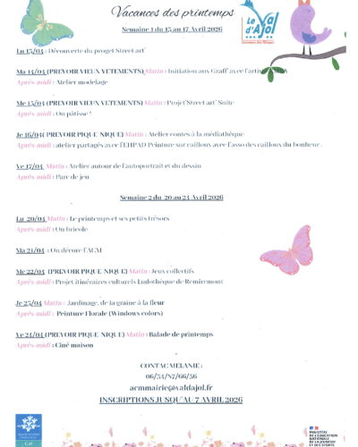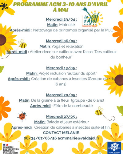 Plus de précisions sur notre sitewww.valdajol.fr/accueil-de-loisirs-la-ruche/et auprès de Mélanie : acmmairie@valdajol.fr06.34.87.66.56