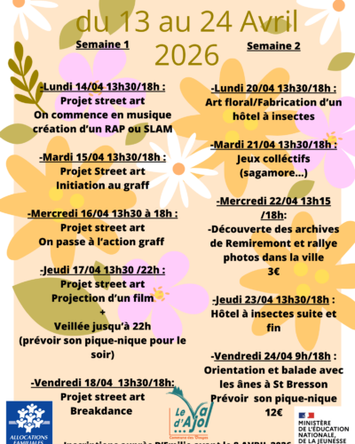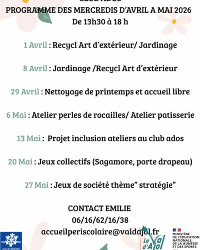 Le Club ADO : programme des animations/activités du 13 au 24 avril